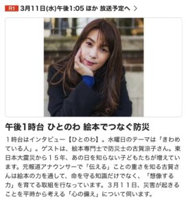 東日本大震災の発生から15年となる3月11日(水)、NHKラジオ第一放送の『まんまる』13時台にゲスト出演いたします。