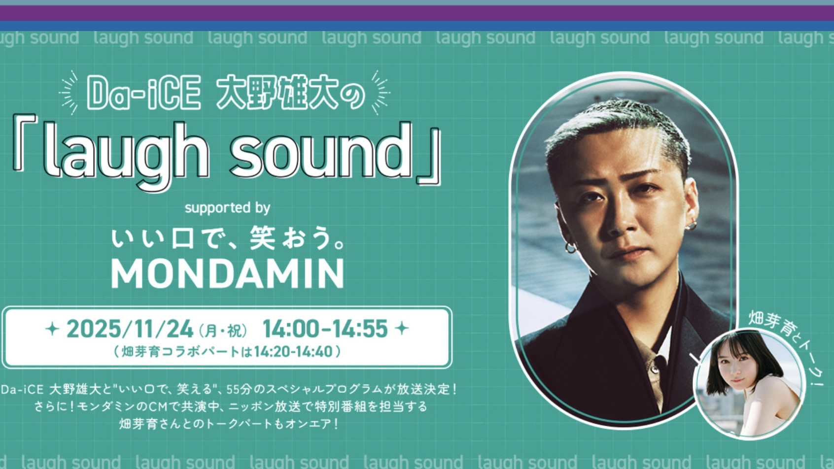 Da-iCE 大野雄大と”いい口で、笑える”、55分のスペシャルプログラムが放送決定!明日をもっと楽しく過ごすために、大野雄大が、あなたのミスや後悔、心のモヤモヤを笑って洗い流します。さらに!モンダミンのCMで共演中、同時刻にニッポン放送で特別番組を担当している畑芽育さんとのトークパートもオンエア!